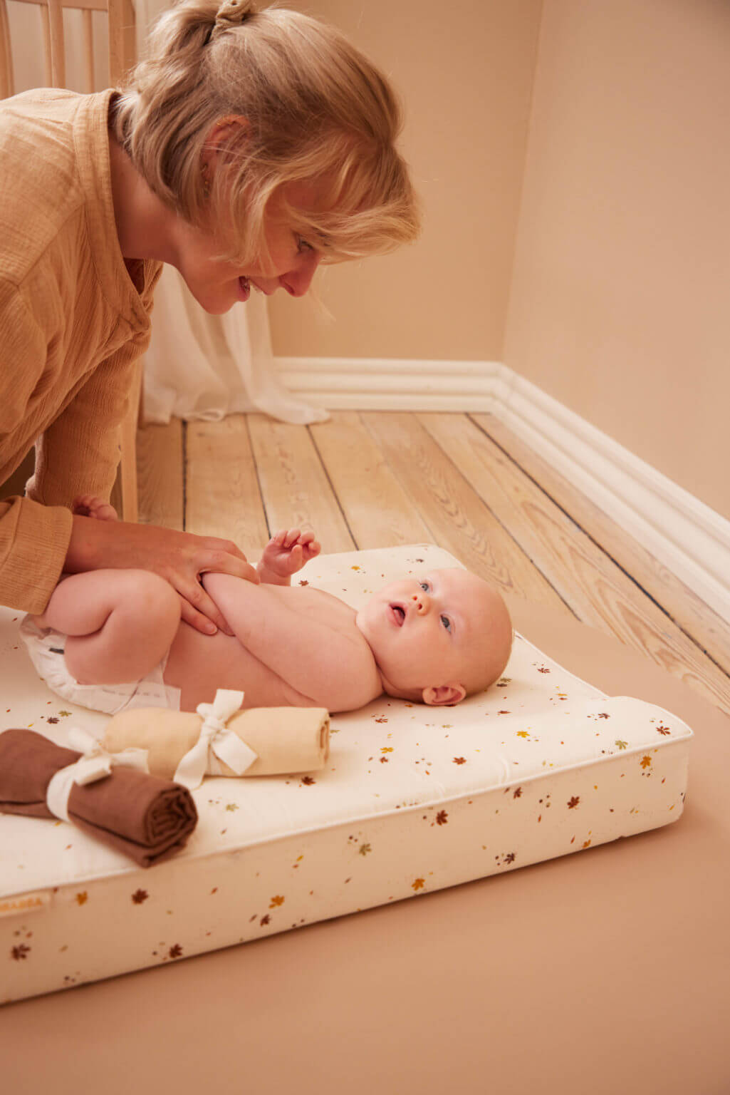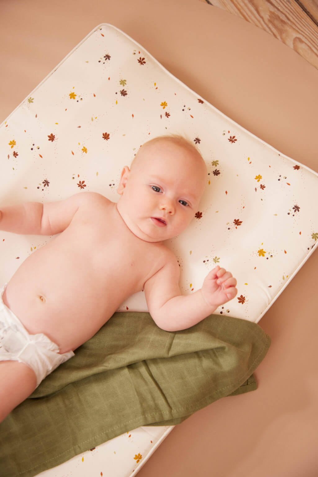 Få vores skønne puslepude, der er omhyggeligt lavet af økologisk satinvævet bomuld med en blød polyesterskumkerne, og skab en nærværende kontakt med dit barn under pusle- og skiftemomenterne. Denne puslepude er ikke blot behagelig, men også praktisk, da den er udstyret med et vandafvisende PU-lag (polyurethan) på overfladen, der gør det let at tørre af efter bleskift.