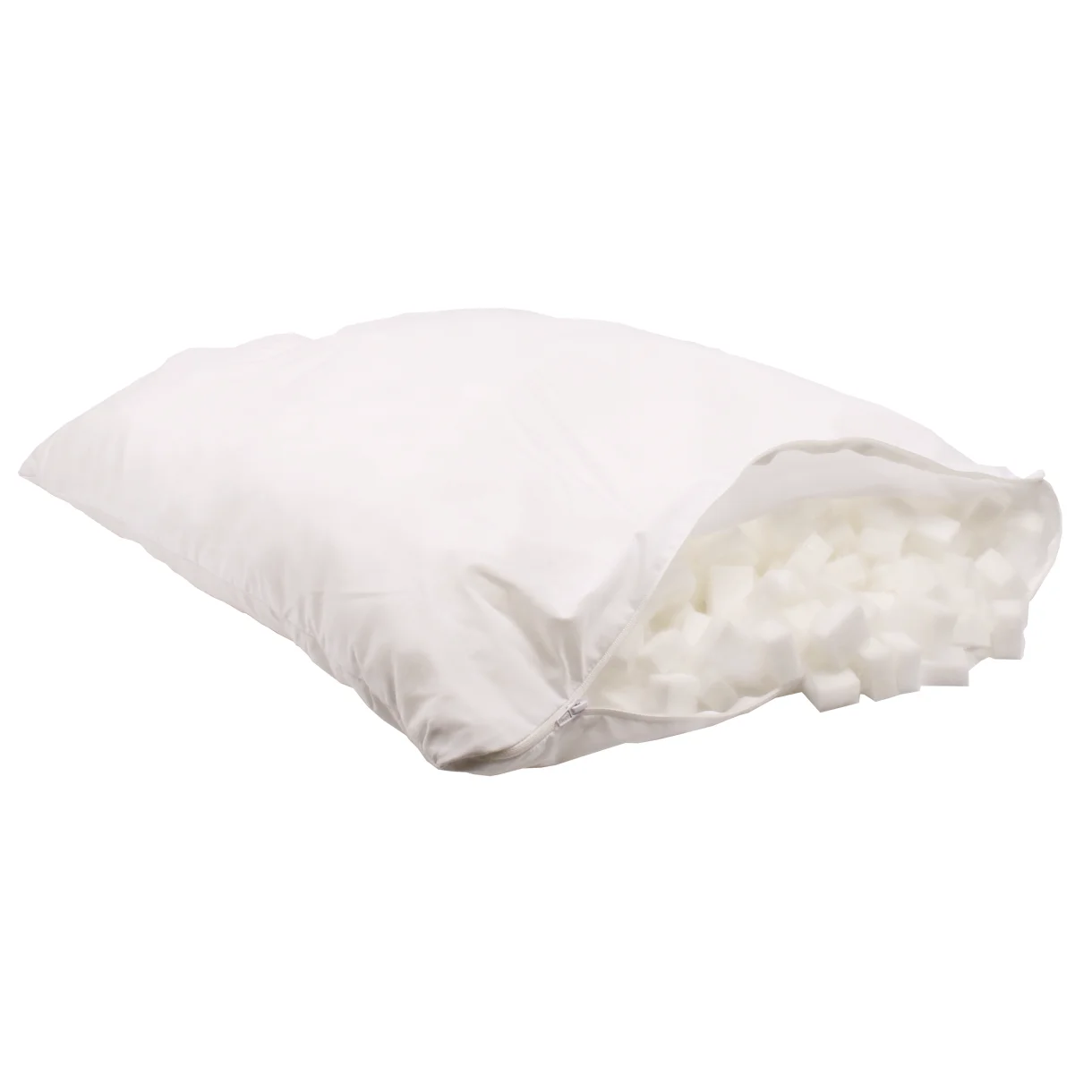 Den ene side er fyldt med bløde dun, der giver en temperaturregulerende effekt, mens den anden side indeholder fibre for en fastere følelse. Det inderste kammer er fyldt med små, støttende skumterninger, som sikrer den rette støtte og gør puden formbar efter dine behov. Du kan nemt justere pudens højde ved at fjerne skumterninger fra det inderste kammer.